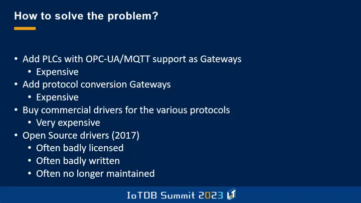 那么如何解决这个问题呢?你可以在网关引入支持 OPC-UA 和 MQTT 的 PLC 设备,但仍然需要为它们支付一定费用。还有一些支持协议转换的网关,不过通常它们的价格也相对较高。你也可以购买一些商业驱动程序,并编写直接与工业硬件通信的软件,但我想上次我看到商业驱动程序的主要供应商,西门子 S7 设备在 Linux 节点上运行驱动程序的价格,大概是每个节点 5000 欧元,所以可以想象这个价格还在急剧上升,非常昂贵。