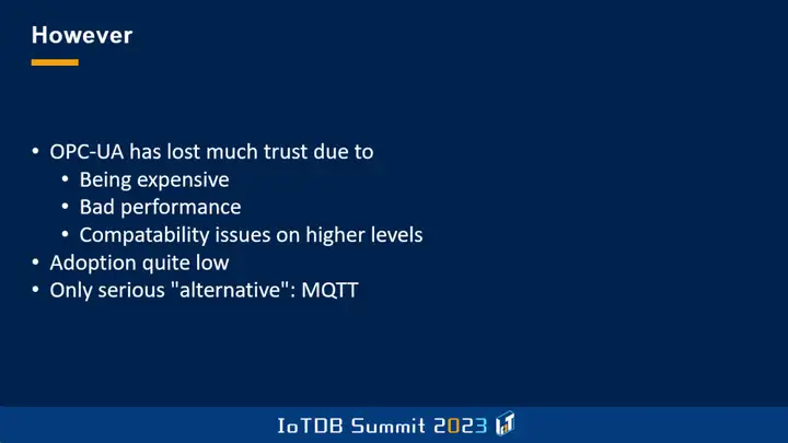 上述这些原因导致了 OPC-UA 的采用率相对较低,与其所宣称的情况差距较大。我认为目前唯一可行的替代方案是 MQTT,但即便是 MQTT,仍然要求对设备进行改装。