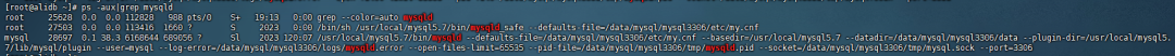 ps -aux|grep mysqldroot 25628 0.0 0.0 112828 988 pts/0 S+ 19:13 0:00 grep --color=auto mysqldroot 27503 0.0 0.0 113416 1660 ? S 2023 0:00 bin/sh usr/local/mysql5.7/bin/mysqld_safe --defaults-file=/data/mysql/mysql3306/etc/my.cnfmysql 28697 0.1 38.3 6168644 689056 ? Sl 2023 120:07 usr/local/mysql5.7/bin/mysqld --defaults-file=/data/mysql/mysql3306/etc/my.cnf --basedir=/usr/local/mysql5.7 --datadir=/data/mysql/mysql3306/data --plugin-dir=/usr/local/mysql5.7/lib/mysql/plugin --user=mysql --log-error=/data/mysql/mysql3306/logs/mysqld.error --open-files-limit=65535 --pid-file=/data/mysql/mysql3306/tmp/mysqld.pid --socket=/data/mysql/mysql3306/tmp/mysql.sock --port=3306