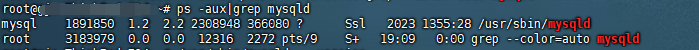 ps -aux|grep mysqldmysql 1891850 1.2 2.2 2308948 366080 ? Ssl 2023 1355:28 usr/sbin/mysqldroot 3183979 0.0 0.0 12316 2272 pts/9 S+ 19:09 0:00 grep --color=auto mysqld