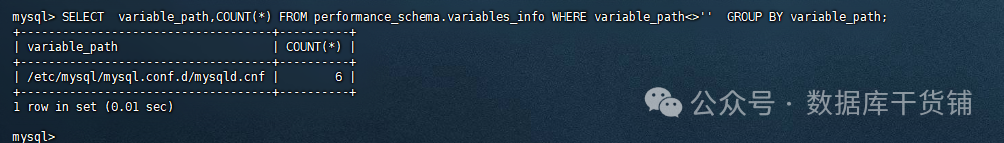 mysql> SELECT variable_path,COUNT(*) FROM performance_schema.variables_info WHERE variable_path<>'' GROUP BY variable_path;+------------------------------------+----------+| variable_path | COUNT(*) |+------------------------------------+----------+| etc/mysql/mysql.conf.d/mysqld.cnf | 6 |+------------------------------------+----------+