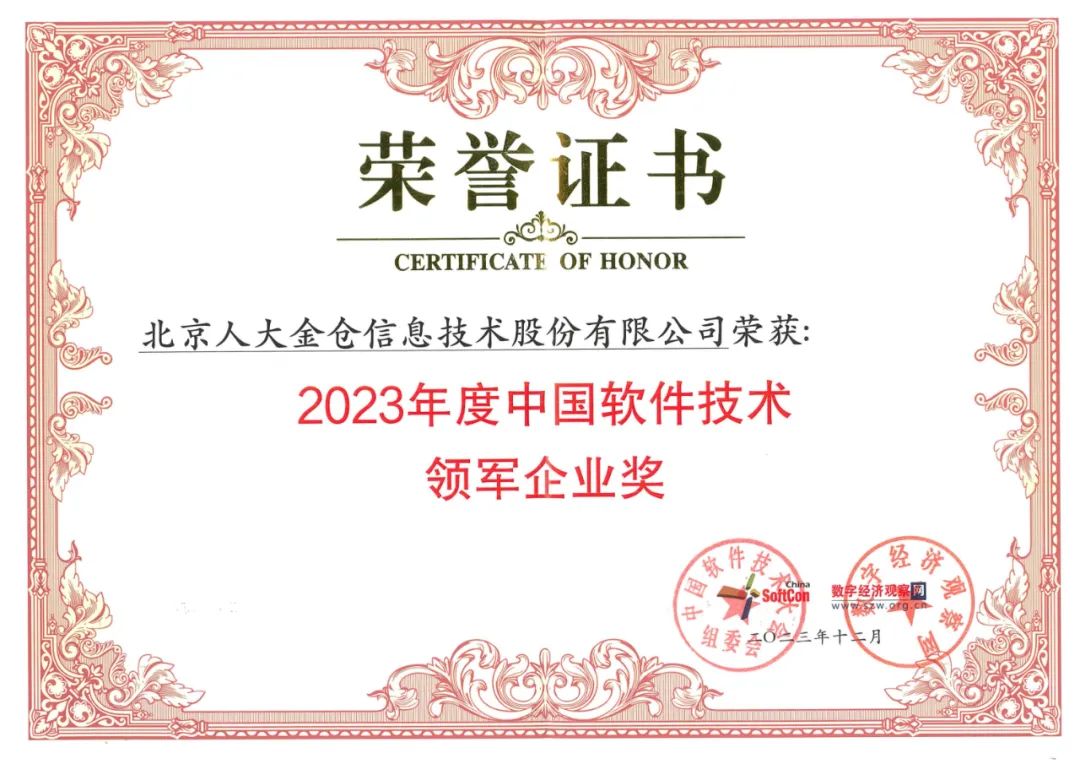 凭借自主研发实力,在数字化转型领域的标杆引领作用,以及推动行业信息技术应用创新的突出贡献,荣获“2023年度中国软件技术领军企业奖”。
