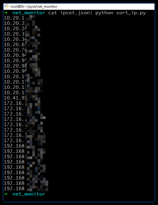 最终与主机有交互的IP都存在 json 数据文件中,通过文本处理可以对 IP 进行排序或其它后续处理: