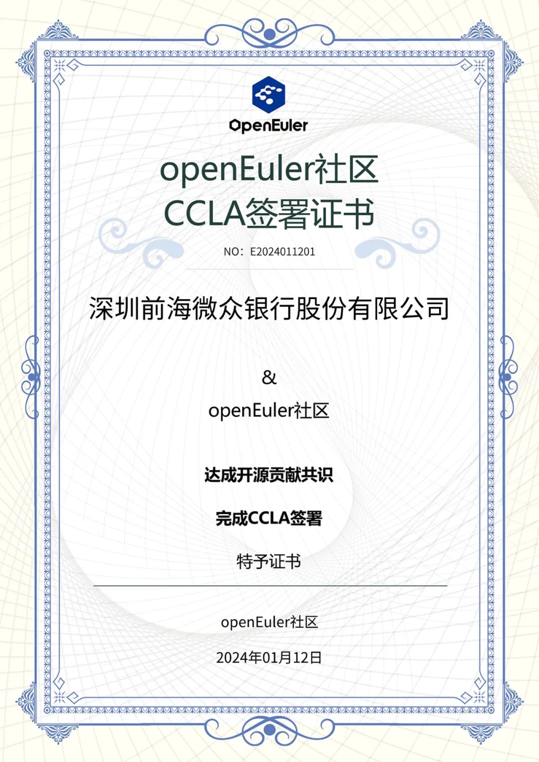 近日,微众银行签署了贡献者许可协议(Company Contributor License Agreement,CCLA),正式加入openEuler社区。