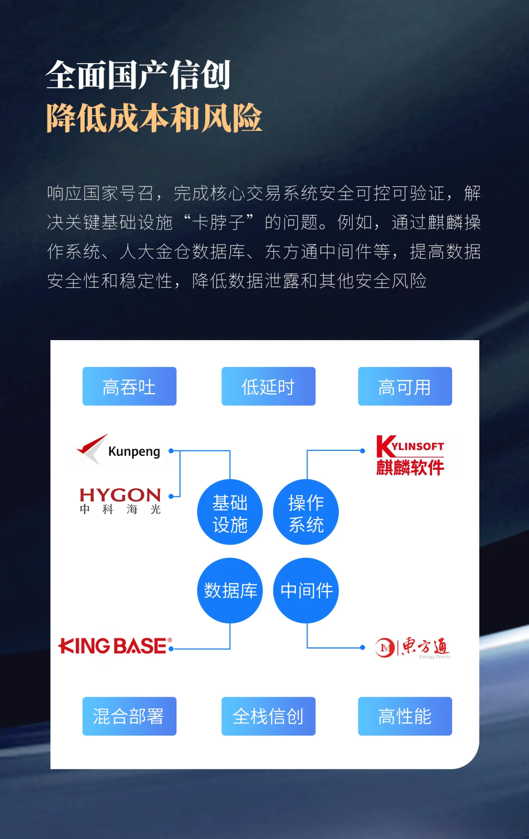 近日,以银河麒麟高级服务器操作系统V10为底层平台的湘财证券湘聚财富核心交易系统正式上线。该项目采用自主CPU、操作系统、中间件和数据库的全栈国产化架构,支撑湘财证券核心交易系统安全稳定运行,是证券行业国产化转型的又一标杆案例,具有行业示范意义。