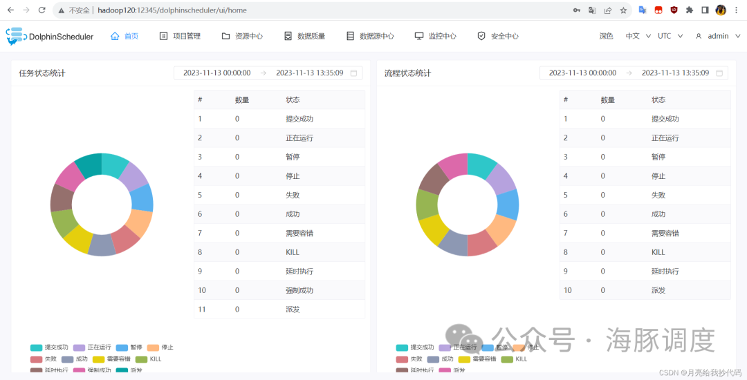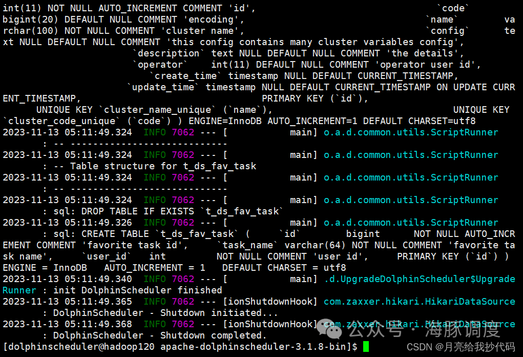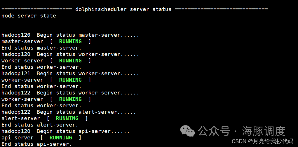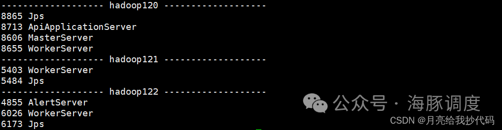 # 进入 DolphinScheduler 的安装目录,注意与Hadoop的启动命令进行区分!cd /opt/module/dolphinscheduler# 一键停止集群所有服务bash ./bin/stop-all.sh# 一键开启集群所有服务bash ./bin/start-all.sh