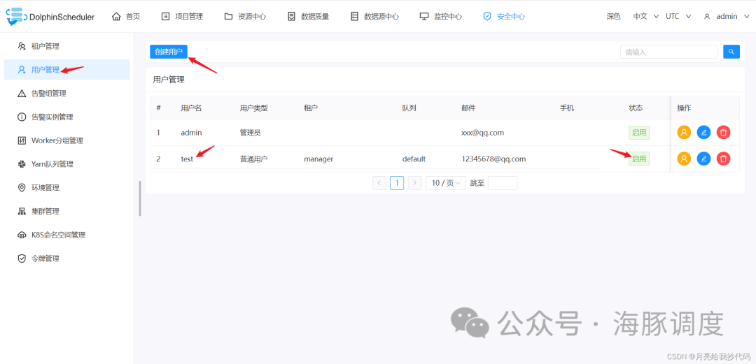 用户管理模块允许管理员创建、编辑和删除用户账户,并配置用户的访问权限。通过用户管理,可以细粒度地控制用户对 DolphinScheduler 的操作权限。