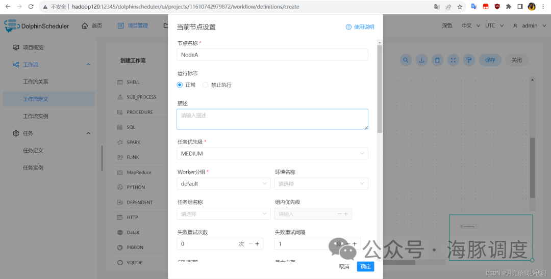 点击工作流定义,选择需要创建的工作流类型,然后编辑工作流相关参数。