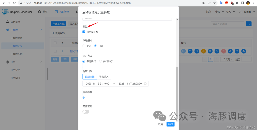 点击运行按钮后,弹出窗口,需要设置相关启动参数,点击【是否是补数】,选择依赖模式、执行方式以及调度日期。