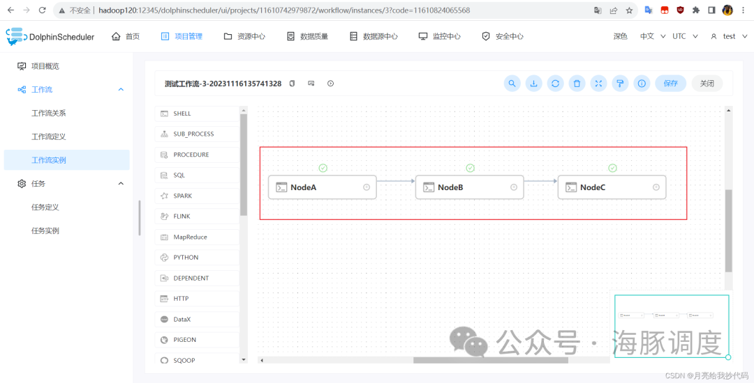 点击工作流实例名称,可以查看各个节点的执行状态: