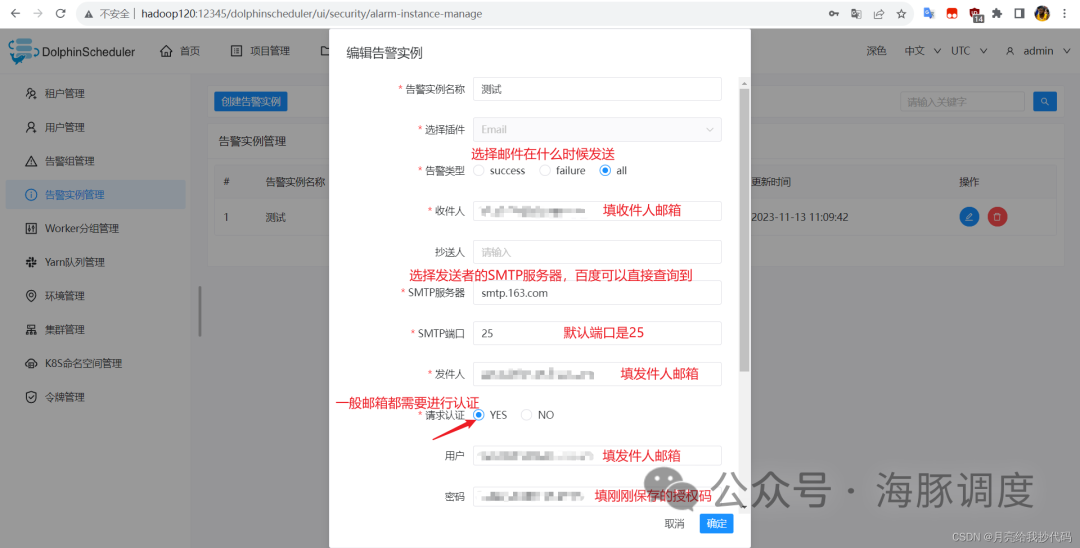 使用管理员账户登录 DolphinScheduler,点击【安全中心 —— 告警实例管理】,创建一个告警实例,类型选择【Email】。