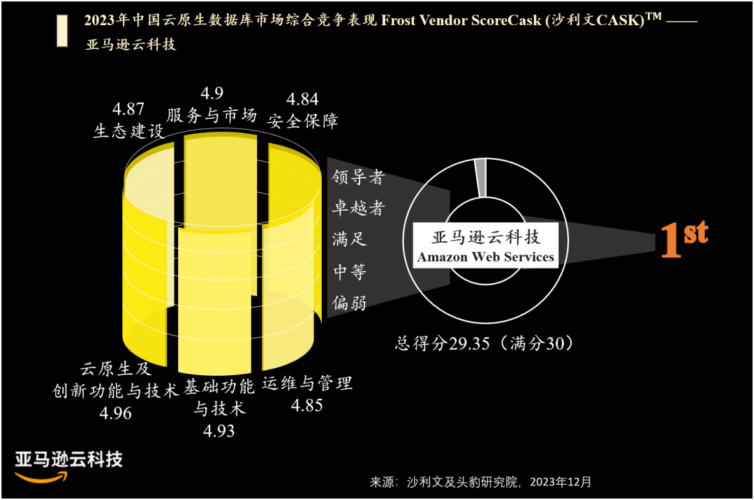 近日,沙利文发布《2023 年中国云原生数据库十大厂商推荐》报告,亚马逊云科技在六项指标中均处于领先地位,综合评分排名第一,被评为 2023 年中国云原生数据库领导者。