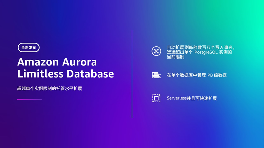 Amazon Aurora 提供完全兼容 PostgreSQL 及 MySQL 的关系型数据库,并在此基础上进行了大量创新,有效提升 I/O 效率,并可便捷地按需进行节点的自动扩展。在此基础上,为进一步加强 Aurora 的无服务器扩展能力,亚马逊云科技全新发布 Amazon Aurora Limitless Database(Aurora Limitless),可将 Aurora 集群的写入能力无缝扩展至每秒百万次写入事务,管理 PB 级数据,同时支持数据强一致性。Aurora Limitless 将以单一的无服务器端点面向用户提供服务,帮助用户完全无感地进行数据库的按需扩展或收缩,用户无需更改应用逻辑以及维护复杂的数据库分片节点。
