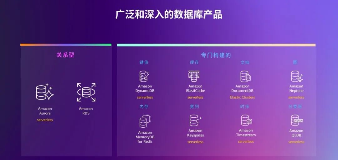 亚马逊云科技目前已经推出全面覆盖用户需求的无服务器数据库系列,包括:关系数据库服务 Amazon Aurora Serverless 与 Aurora Limitless Database,完全托管的 PB 级云数据仓库服务 Amazon Redshift,支持键-值存储和文档型数据结构的 NoSQL 数据库服务 Amazon DynamoDB,缓存数据库 Amazon ElastiCache Serverless,开源的宽列数据存储 Amazon Keyspaces,时许数据库 Amazon Timestream,完全托管的图形数据库服务 Amazon Neptune 以及完全托管的分类账数据库 Amazon Quantum Ledger Database (QLDB) 等。