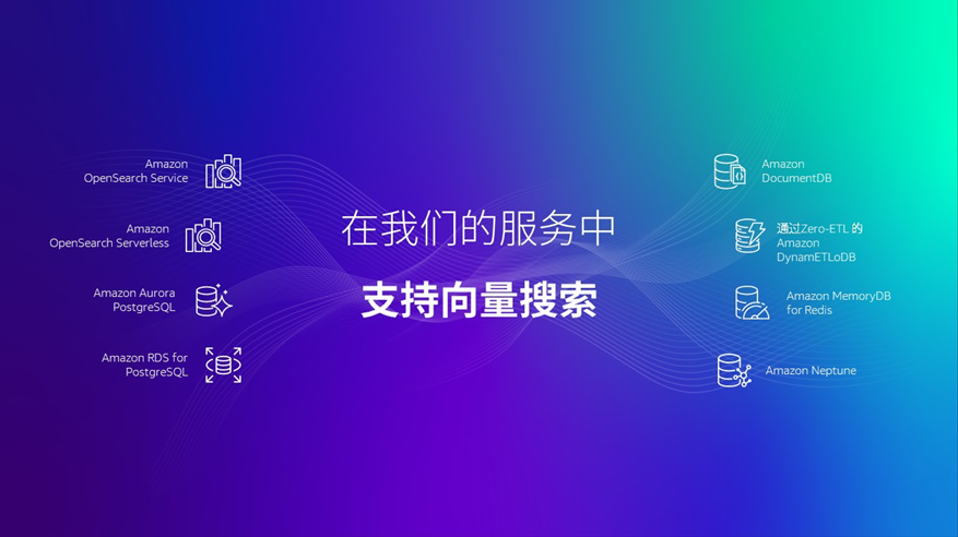 亚马逊云科技在 2023 年持续推进将向量化检索能力嵌入全线数据库服务中。目前 Amazon Aurora、 Amazon RDS、 Amazon OpenSearch Service、Amazon OpenSearch Serverless、Amazon DocumentDB 、Amazon MemoryDB for Redis、Amazon Neptune 已经正式提供向量化能力,可以直接在这些服务中存储并处理向量数据;Amazon DynamoDB 可以通过与 OpenSearch 的 Zero-ETL 集成来获得向量检索功能。
