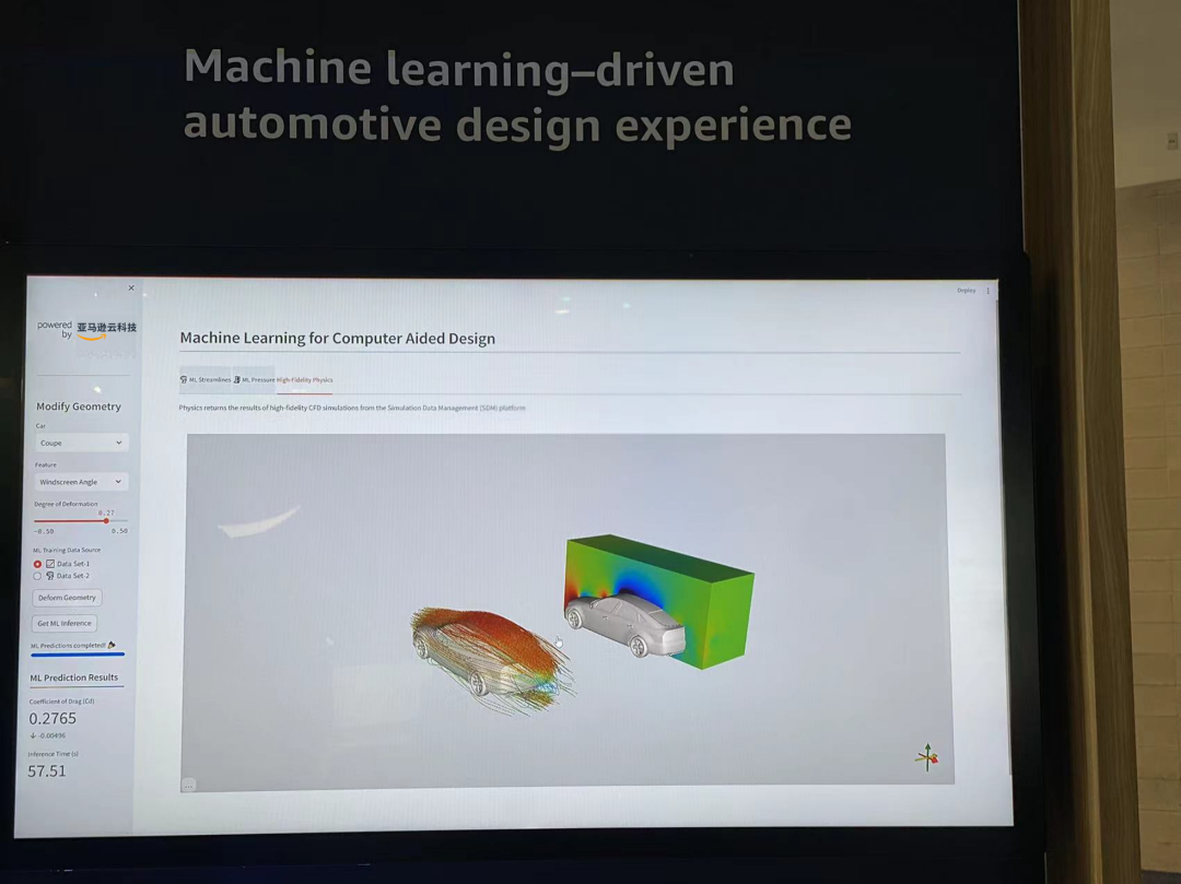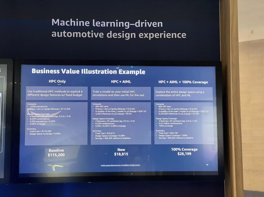 专家现场对比讲解了使用传统 HPC 和 HPC + 机器学习组合,在完成 CAE 针对4个外形参数的计算过程中,如借助机器学习进行设计推理,其误差范围仅为1%-2%,但可以大幅缩短汽车的设计周期并降低成本,设计团队通过训练和部署模型,可快速对整个 Design Space 进行推理,利用推理结果甄选出进行全量 HPC 计算的参数组合。