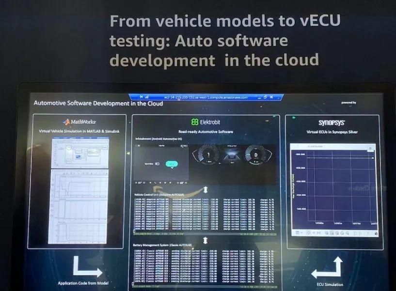 云力量正在深刻的影响着汽车软件开发,在展台技术专家结合 MathWorks 的车辆建模和仿真工具、Elektrobit 的 AutoSAR 中间件和 Synopsys 的虚拟 ECU 仿真平台 Silver 演示了端到端的放电管理系统软件模块开发。