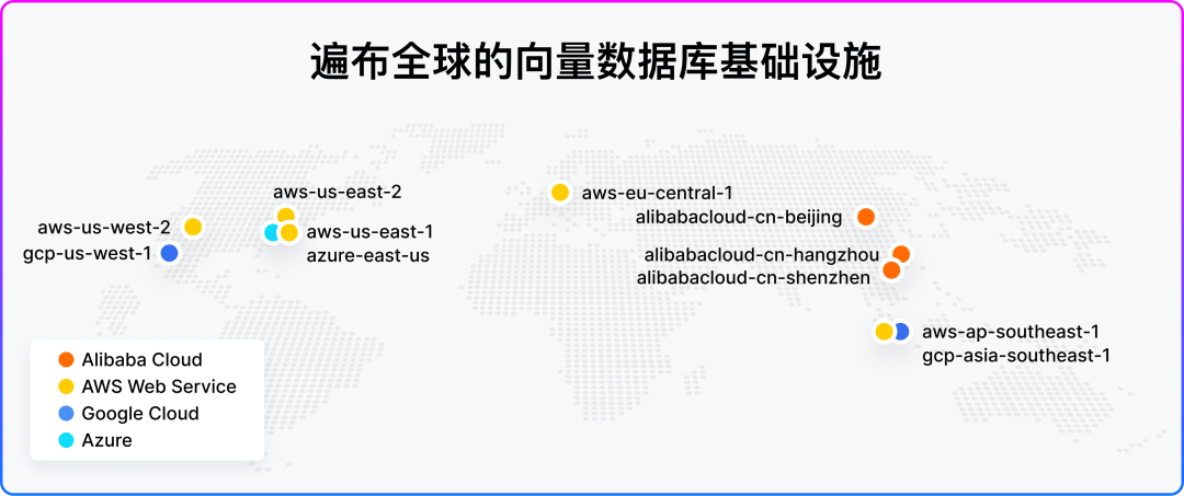 截至目前,Zilliz Cloud 已实现全球 4 大云 11 个节点的全覆盖,除了在中国的杭州、北京、深圳三大服务区,其他 8 个节点分布在海外,包括美国的弗吉尼亚州、俄勒冈州、德国的法兰克福、新加坡等城市和地区。至此,Zilliz 已成为全球首个提供海内外多云服务的向量数据库企业。