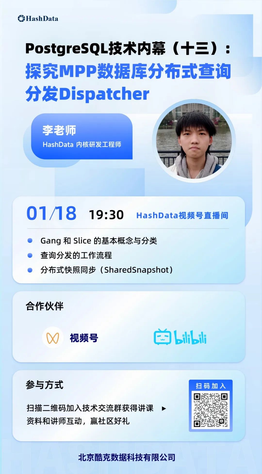 在这些实际效果之外,Dispatcher更是代表了一种分发理念,对于理解分布式系统的运行将很有帮助。本周四,我们将邀请到HashData内核研发工程师李老师,为大家讲解Slice与Gang、查询分发工作流程、分布式快照同步等概念与特性,欢迎感兴趣的朋友们与我们相约直播间,一起学习成长!