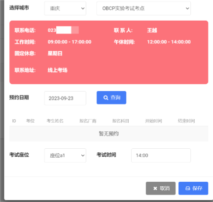 ② 登录账号,进入个人的用户中心里面去预约上机考试。 选择“OBCP实验考试”,考点必须选择“重庆”考点