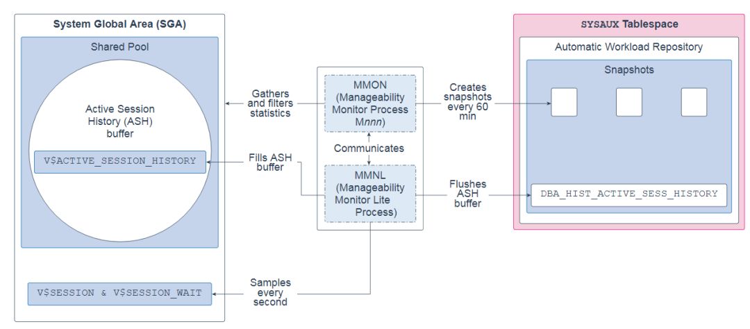 MMON从SGA收集各种内存统计信息,过滤它们,然后在自动工作负载存储库(AWR)中每60分钟创建一次这些统计信息的快照。60分钟是默认值,可以更改。它还执行自动数据库诊断监视(ADDM)分析,并为超过其阈值的指标发出警报。