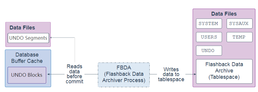 当修改跟踪表的事务提交时,FBDA会检查是否生成了新的撤消,过滤了与标记为存档的对象相关的内容,以及将撤消信息的副本复制到闪回数据存档表空间中。FBDA维护当前行的元数据并跟踪已归档的数据量。