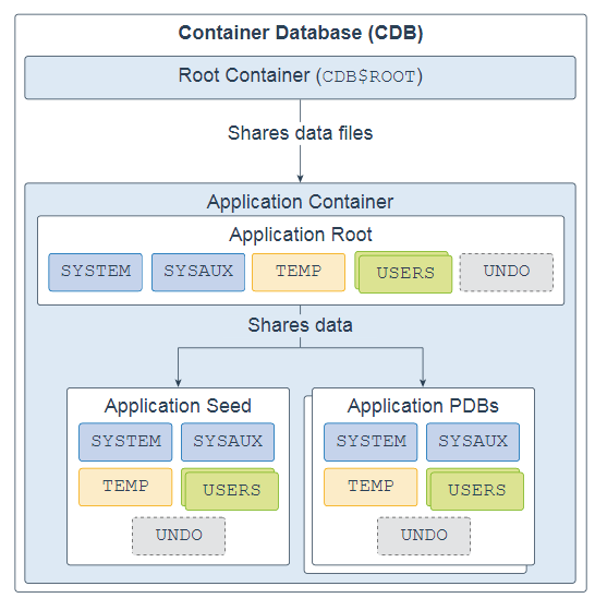 应用程序根,应用程序种子和应用程序PDB均具有 SYSTEM,SYSAUX, TEMP,USERS和可选的UNDO表空间。每个表空间代表一个或多个数据文件。