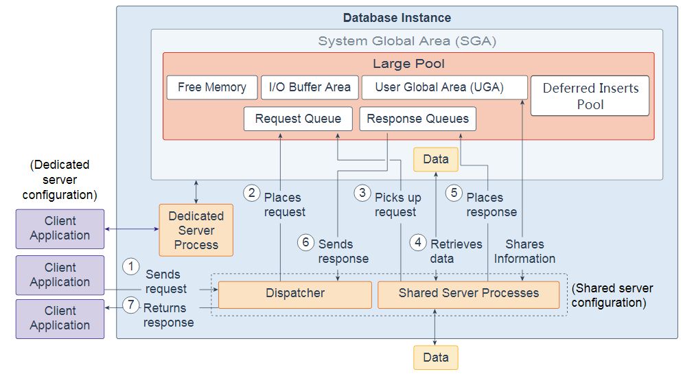 共享服务器进程对数据库进行所有必要的调用以完成请求。首先,共享服务器进程访问共享池中的库高速缓存以验证所请求的项; 例如,它检查表是否存在,用户是否具有正确的权限,等等。接下来,共享服务器进程访问缓冲区高速缓存以检索数据。如果数据不存在,则共享服务器进程访问磁盘。不同的共享服务器进程可以处理每个数据库调用。因此,解析查询,获取第一行,获取下一行和关闭结果集的请求可以由不同的共享服务器进程处理。由于不同的共享服务器进程可以处理每个数据库调用,因此用户全局区域(UGA)必须是共享内存区域,因为UGA包含有关每个客户端会话的信息。或者相反,UGA包含有关每个客户端会话的信息,并且必须可用于所有共享服务器进程,因为任何共享服务器进程都可以处理任何会话的数据库调用。