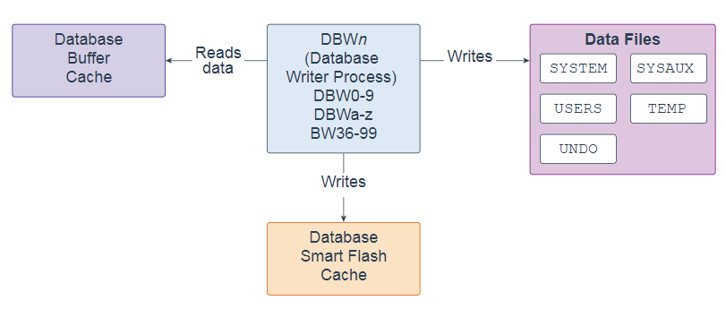写库进程(DBWn)是一个后台进程,主要将数据块写入磁盘。它还处理检查点,文件打开同步和Block Written记录的日志记录。配置Flash Cache时,DBWn还会写入数据库智能闪存缓存(Flash Cache)。