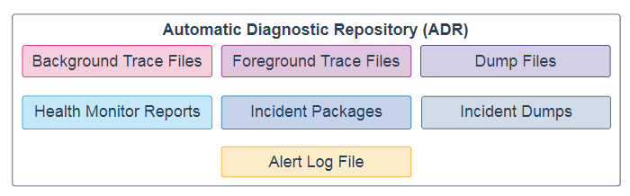 自动诊断存储库(ADR)是用于数据库诊断数据的系统范围的跟踪和日志记录中央存储库。它包括以下项目: