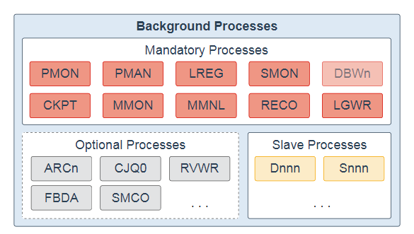 所有典型的数据库配置中都存在强制后台进程。默认情况下,这些进程在读/写数据库实例中运行,并使用最低配置的初始化参数文件启动。只读数据库实例会禁用其中一些进程。强制性后台进程包括进程监视进程(PMON),进程管理进程(PMAN),监听器注册进程(LREG),系统监视进程(SMON),数据库写入进程(DBWn),检查点进程(CKPT),可管理性监视进程( MMON),Manageability Monitor Lite Process(MMNL),Recoverer Process(RECO)和Log Writer Process(LGWR)。