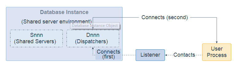 来自用户的请求是单个API调用,它是用户SQL语句的一部分。在专用服务器环境中,一个服务器进程处理单个客户端进程的请求。每个服务器进程都使用系统资源,包括CPU周期和内存。在共享服务器环境中,会发生以下操作: