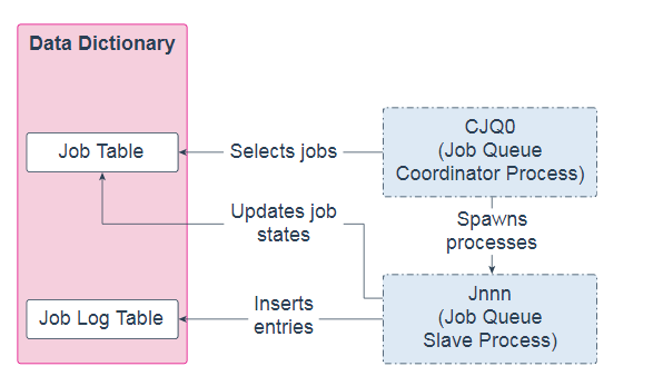 作业队列协调器进程(CJQ0)是一个后台进程,它选择需要从数据字典运行的作业,并生成作业队列从属进程(Jnnn)以运行作业。Oracle Scheduler根据需要自动启动和停止CJQ0。该JOB_QUEUE_PROCESSES 初始化参数指定的可为作业的执行创建的最大进程数。CJQ0仅启动与要运行的作业数和可用资源所需的作业队列进程数相同的数量。