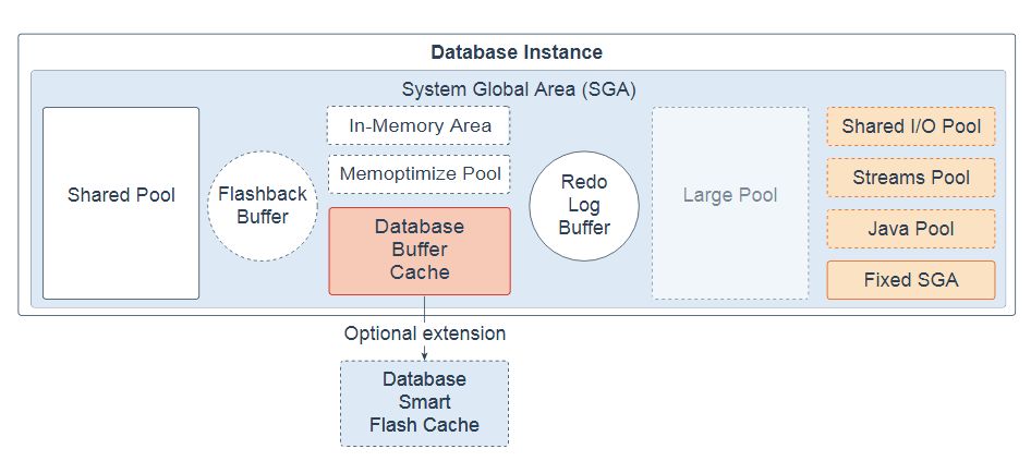 数据库缓冲区缓存:存储区域是否存储从数据文件中读取的数据块的副本。缓冲区是主存储器地址,缓冲区管理器临时缓存当前或最近使用的数据块。并发连接到数据库实例的所有用户共享对缓冲区缓存的访问权限。