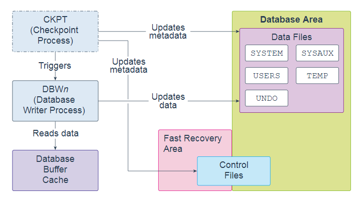 检查点进程(CKPT)是一个后台进程,在特定时间通过消息传递Database Writer Process(DBWn)启动检查点请求以开始写入脏缓冲区。完成单个检查点请求后,CKPT会更新数据文件头和控制文件以记录最近的检查点。