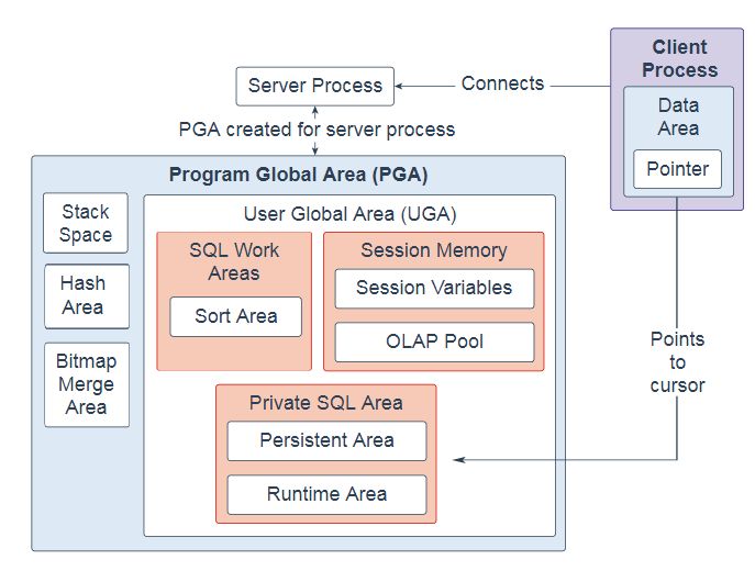 用户全局区域(UGA):共享服务器和Oracle XA接口的会话内存(用于事务与多个数据库交互的位置)