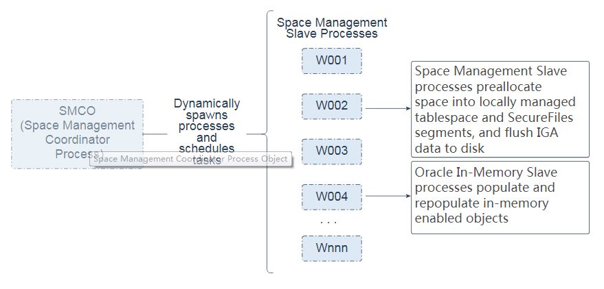 空间管理协调进程(SMCO)是一个后台进程,用于安排各种空间管理任务的执行,包括主动空间分配和空间回收。SMCO动态生成空间管理从属进程(Wnnn)来实现这些任务。请注意,内存协调器进程(IMCO)是一个后台进程,可启动背景填充和重新填充列数据。