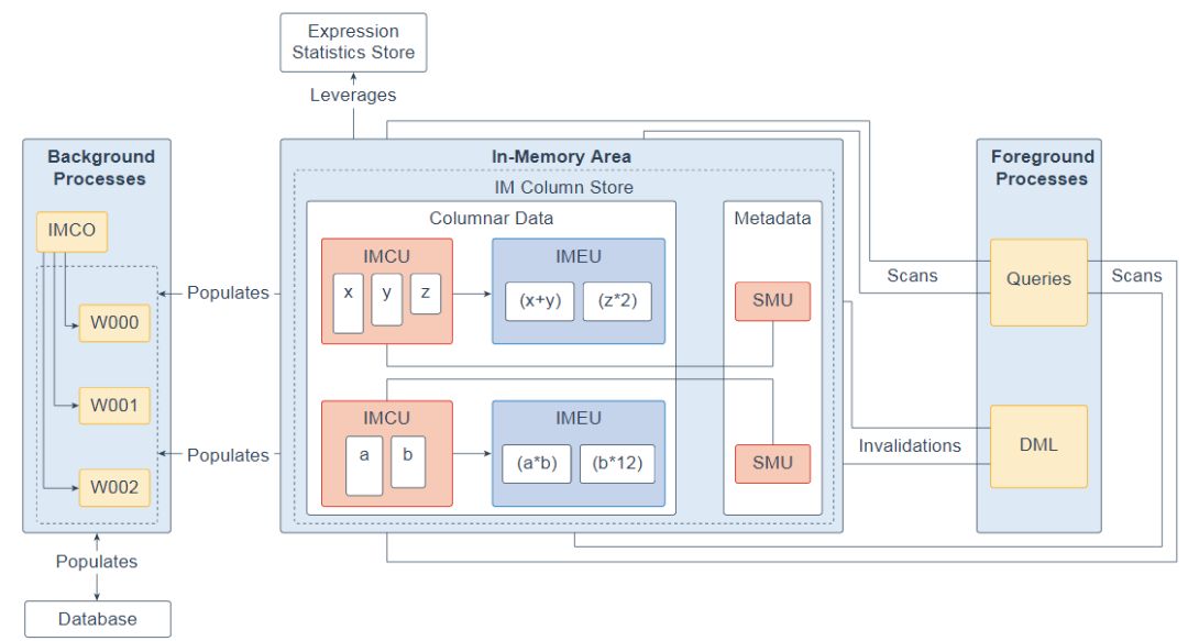 从概念上讲,IMEU是其父IMCU的逻辑扩展。就像IMCU可以包含多个列一样,IMEU可以包含多个虚拟列。每个IMEU映射到一个IMCU,映射到同一行集。IMEU包含其相关IMCU中包含的数据的表达式结果。填充IMCU时,也会填充关联的IMEU。