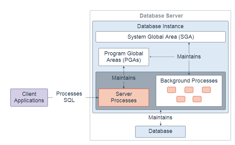 Oracle数据库还创建服务器进程以代表客户端程序处理与数据库的连接,并为客户端程序执行工作; 例如,解析和运行SQL语句,以及检索结果并将结果返回给客户端程序。这些类型的服务器进程也称为前台进程。