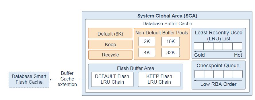 数据库智能闪存缓存(闪存缓存):允许您使用闪存设备来增加缓冲区缓存的有效大小,而无需添加更多主内存。Flash缓存可以通过将数据库缓存的频繁访问数据存储到闪存而不是从磁盘读取数据来提高数据库性能。当数据库请求数据时,系统首先查找数据库缓冲区缓存。如果未找到数据,则系统会在Database Smart Flash Cache缓冲区中查找。如果它没有在那里找到数据,那么它只会在磁盘存储中查找。您必须在Oracle Real Application Clusters环境中的所有实例或没有实例上配置闪存缓存。