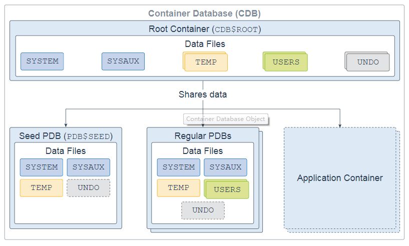 CDB由一个CDB根容器(也称为根),一个种子可插拔数据库(种子PDB),零个或多个用户创建的可插拔数据库(简称为PDB)以及零个或多个应用程序容器组成。整个CDB称为系统容器。对于用户或应用程序,PDB在逻辑上显示为单独的数据库。