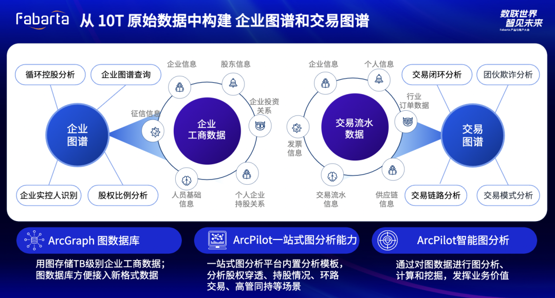 通过刚才的介绍,大家可以了解到大树科技在业务发展过程中的规划和诉求,Fabarta 为我们解决了哪些痛点,给我们带来了哪些帮助,我将通过大树科技的实践与大家分享介绍。我们借助 Fabarta 的 ArcGraph 图数据库和 ArcPilot 一站式图分析平台,基于自身生态内的数据资产构建相关的关系图谱或知识图谱。在当前场景中,我们主要涉及两个图谱:企业关系图谱和交易流水图谱。企业关系图谱依赖工商数据,目前在册工商企业接近 1.7 亿家,包括个体工商户。我们可以基于这些全户数据,根据他们之间人与人的关系,人与企业的关系,企业与企业的关系构建一个完整、复杂和全面的企业关系图谱,用于空壳企业识别、关联人或关联企业查询等任务。甚至在风险传导路径识别方面,我们也会利用企业图谱进行相关工作。交易流水图谱源自我们的税票数据。一个完整的发票,无论是纸质还是电子版,都包含上下游交易的信息,包括交易对手、买卖的产品和提供的服务。我们通过挖掘这些数据,天然地形成了一些图的属性,将企业作为中间节点,上下游作为关联节点,两者之间的交易形成了边,这样的图谱有助于我们挖掘风控层面的其他信息。我们可以判断交易闭环是否存在,分析交易链路,并识别核心交易结构或模式。这些信息对于判断企业风险、关联风险以及风险传导路径都具有重要价值。Fabarta 图技术助力智能风控