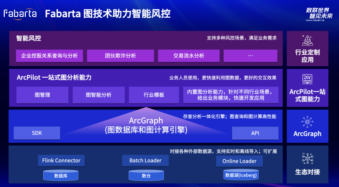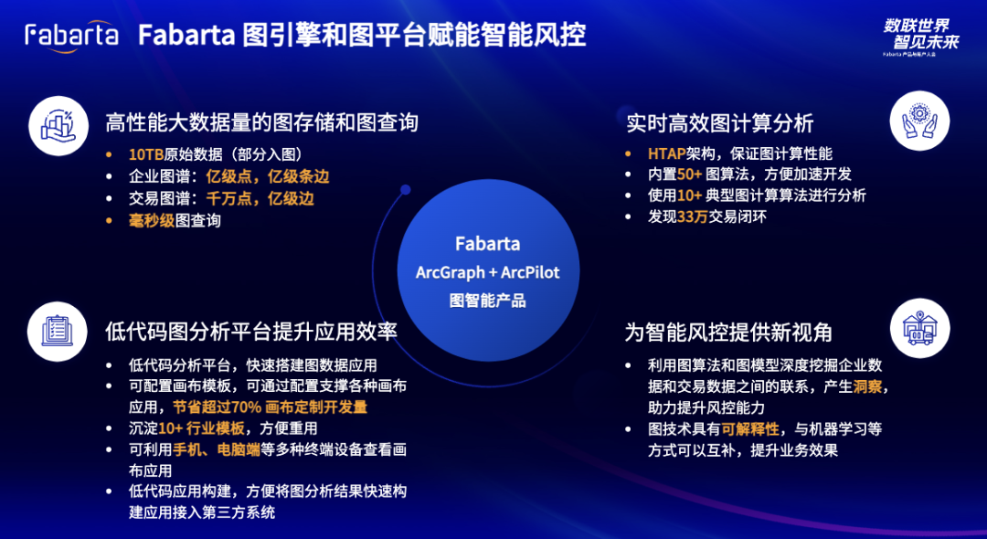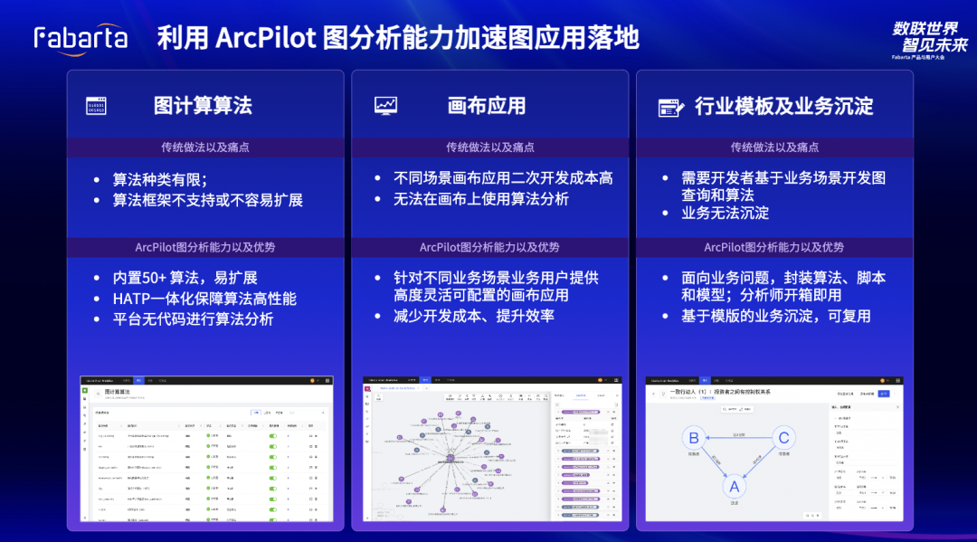 刚才提到 Fabarta 的 ArcPilot 平台提供了内置丰富算法的同时也具备很好的扩展性。它采用了 HTAP 架构,支持在大规模图谱上进行图计算,这为我们在企业场景下广泛应用图计算提供了前提条件。ArcPilot 平台的画布应用非常灵活,对于分析师和业务人员来说非常友好,同时也显著降低了我们的开发成本、提升了开发进度和开发效率。