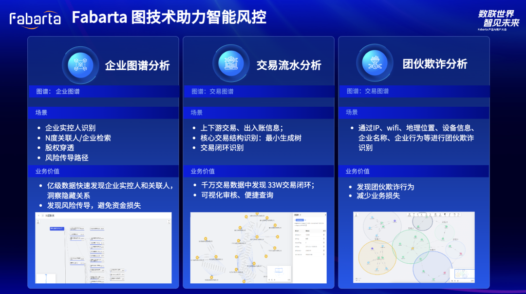 总结一下,Fabarta 为大树带来了以下几个方面的赋能:- 高性能大数据量图存储和图查询:Fabarta 的图数据库具备高性能,能够处理大规模数据量的图谱。我们在构建图谱时涉及的节点和边数量达到了过亿级别,在这种情况下,Fabarta 的查询效率能够达到毫秒级,这对于我们的业务非常重要。此外,Fabarta 采用了 HTAP 架构,使得在图计算中能够高效处理复杂模型计算,具备高吞吐和高反应效率。它还内置了标准化的图算法,并具备相对灵活的模型扩展能力,因此在图计算方面,我们的效率大大提升。在交易闭环场景识别的场景中,在亿级数据库中,我们已经发现了33万个交易闭环,这对于我们进行反欺诈等业务非常有价值。