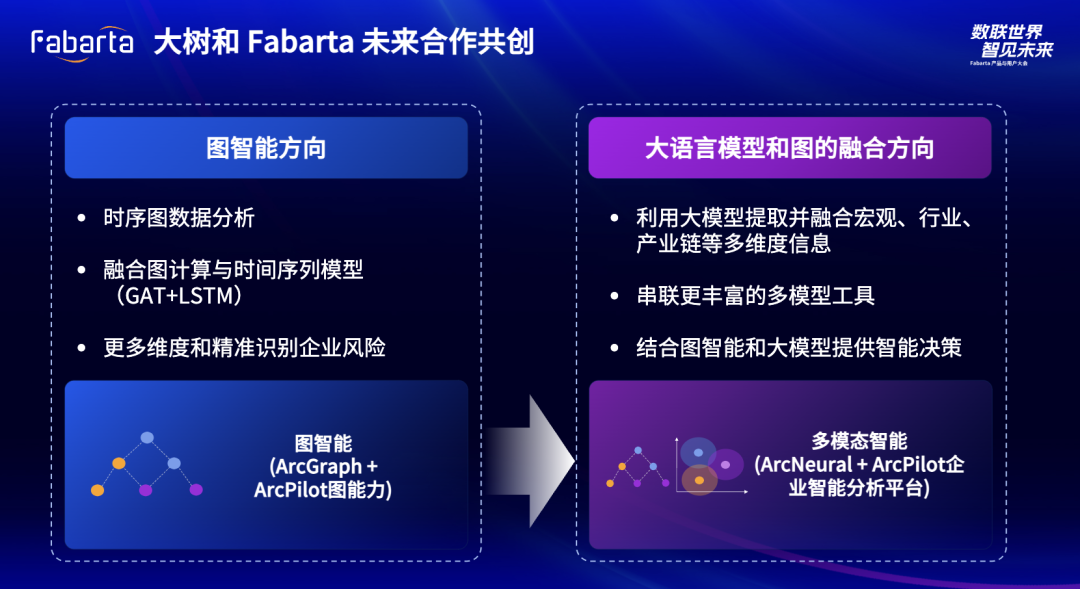 我们期待未来与 Fabarta 展开更深入的合作。通过与 Fabarta 的合作,在图挖掘和图算法的应用方面,我们已经取得了长足的进步。我们目前所构建的图是基于时间截面或相近时间截面的,我们知道到描述一个人或企业的风险除了关注当前时点的表现外,还需要关注其在一系列时间序列上的变化和行为。图也是如此,完整的图分析是基于时序图进行的。在单一时间截面上,我们可以使用GAT来描述风险特征,而在时序图中,我们将整合时间序列算法到最终模型中,以实现更精准的风险识别和分层。例如,融合图计算与时间序列模型(GAT+LSTM)算法,来构建最终的模型。另外一个应用场景是大家屡次提及的 AIGC 的应用场景。在大树科技的业务领域中,我们希望 AIGC 可以从我们关注的信息中提取并融合与我们关注的宏观行业和产业链等多个维度相关联的多模态信息,并将其有效整合在一起。随着人工智能在设计层面不断完善,我们希望 AI Agent 能够调用大树在整个体系中积累的各种类型的模型工具以及与合作伙伴合作开发的模型,对前述多模态融合数据进行更深入的挖掘,从而提升风控业务的质量,实现更成熟的大数据智能决策。最后,在当前的市场环境下,我们靠近并投身于人工智能浪潮,我个人认为恰逢其时,大树科技希望在不久的将来与 Fabarta 携手共进,成为这个时代的创新者。