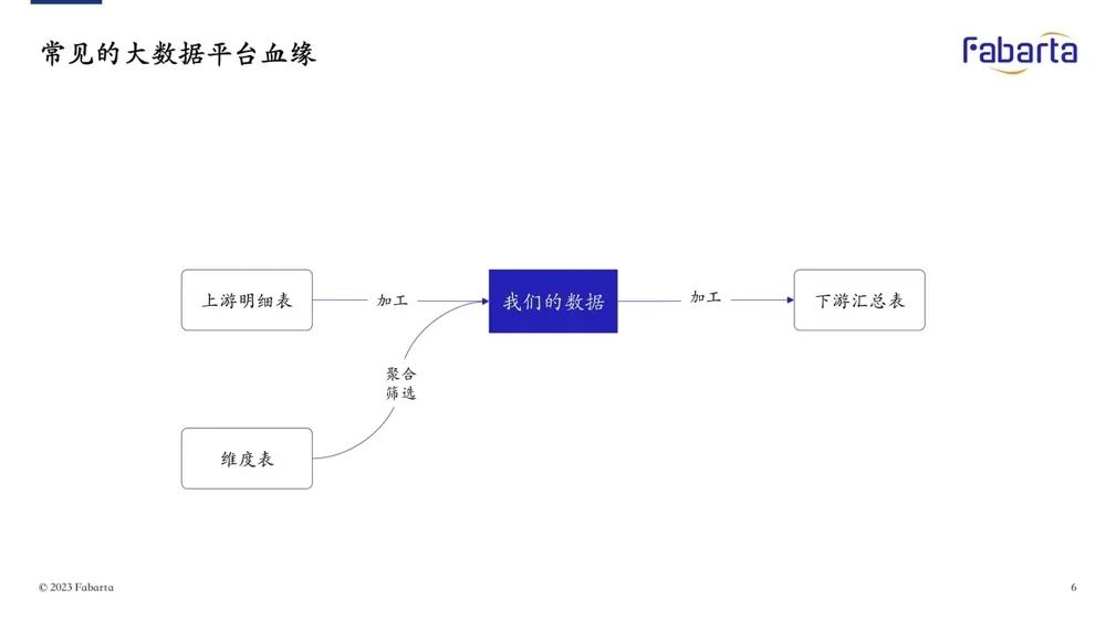 其次,数据血缘应该包含不同类型的关系。无论是 DAMA、Gartner 报告还是信通院的研究,都明确指出数据血缘应涵盖传输、存储、加工和关联等多个关系。然而,当前许多数据血缘平台更加注重加工关系,这种偏重在目前看来较为片面。加工关系仅是数据血缘的一部分,例如从明细表到汇总表的加工关系,虽然属于血缘关系的一部分,但是否能满足全面的数据资产管理、数据编织以及对数据的要求仍值得商榷。事实上,完整的数据血缘应涵盖传输、存储、加工和关联等多个方面,才能真正称之为完备的数据血缘。