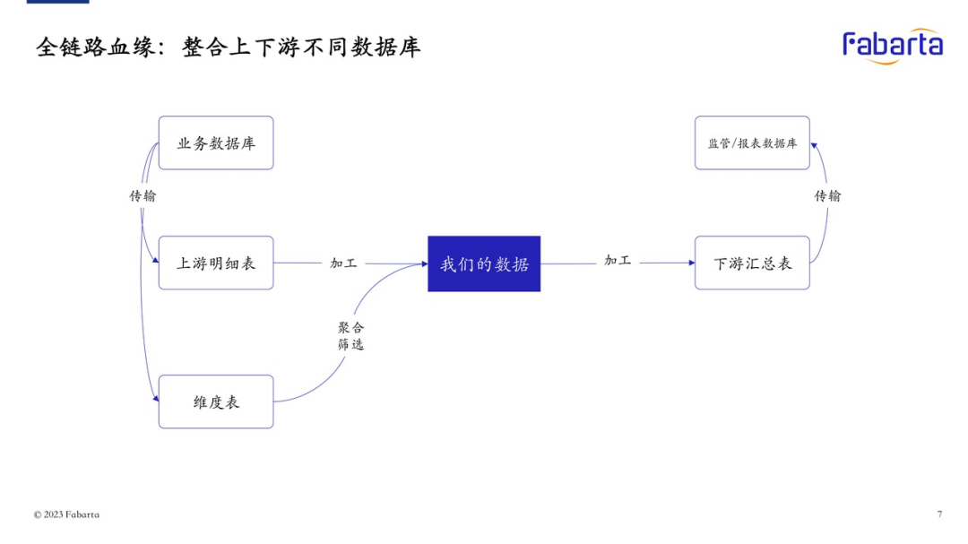 数据血缘的类型、复杂度和演进过程究竟是怎样的呢?同时,我们对现代化业务对数据血缘平台的具体要求是什么?让我们来简单总结一下常见的大数据平台的情况。这些平台是目前许多客户生产环境中常用的解决方案,它们通常是建立在单一的数据基础设施上,可能是 Hadoop 平台或其他大型数据库平台。虽然这些平台不涉及跨平台的数据血缘关系,但在平台内部数据血缘关系变得非常复杂。这是因为它涉及到上下游表之间精细的加工关系。如果按照严格的自上而下的维度建模方法构建,血缘关系可能包含多个层次的表,例如明细层、汇总层、应用层和维度表。在这种情况下,加工、聚合和筛选的关系需要严谨地按照维度建模方法处理,使得血缘关系变得复杂而严谨。解析这些关系对于我们来说非常重要,因为它不仅有助于我们理解数据血缘的含义,还可以指导大数据平台的建设。这也是我们目前常见到的数据血缘的现状。那么,刚才提到的这种模式是否符合企业内部的要求呢?从我个人的观察来看,可能越来越多的情况下不再满足要求。我们不仅关注单一数据基础设施内部的情况,还需要考虑到上下游不同数据库之间的关系。举个例子来说,现在我们更加关注数据安全的问题。然而,仅仅在大数据平台内部管理数据安全是不够的。因为一些敏感数据和高安全等级的数据可以直接从业务系统的数据库中获取。因此,在涉及到数据安全分类和分级的场景中,我们必须将整个业务系统的数据库考虑在血缘关系中,通过血缘链路来进行数据分级分类。这就涉及到业务数据库与大数据平台、数据中台或数据湖等单一数据基础设施之间的数据传输。1.全链路血缘:整合上下游不同数据库