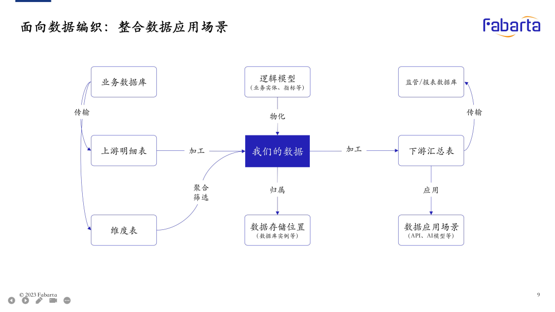 另一方面,我们还需要考虑面向数据的运维。这涉及到确定数据存储的位置,例如选择使用哪种数据库,以及数据库的逻辑结构是哪个版本,是否存在某些重叠关系等。整个过程涉及从逻辑模型到物理模型的转换,将其融入到数据血缘关系中,形成数据资产的图谱。然而,仅仅依靠这些还不能构建完整的数据资产图谱,因为数据资产图谱本身是一个广泛而综合的概念。但是逻辑模型、物理模型以及数据技术属性,包括上下游的血缘关系,是构建数据资产图谱不可或缺的一部分。如果我们想要构建数据资产图谱,以便更多的业务人员能够使用我们的数据资产,那么理解企业现有的数据资产,并构建如下图所示的血缘关系图是非常必要的。3.面向数据编织:整合数据应用场景