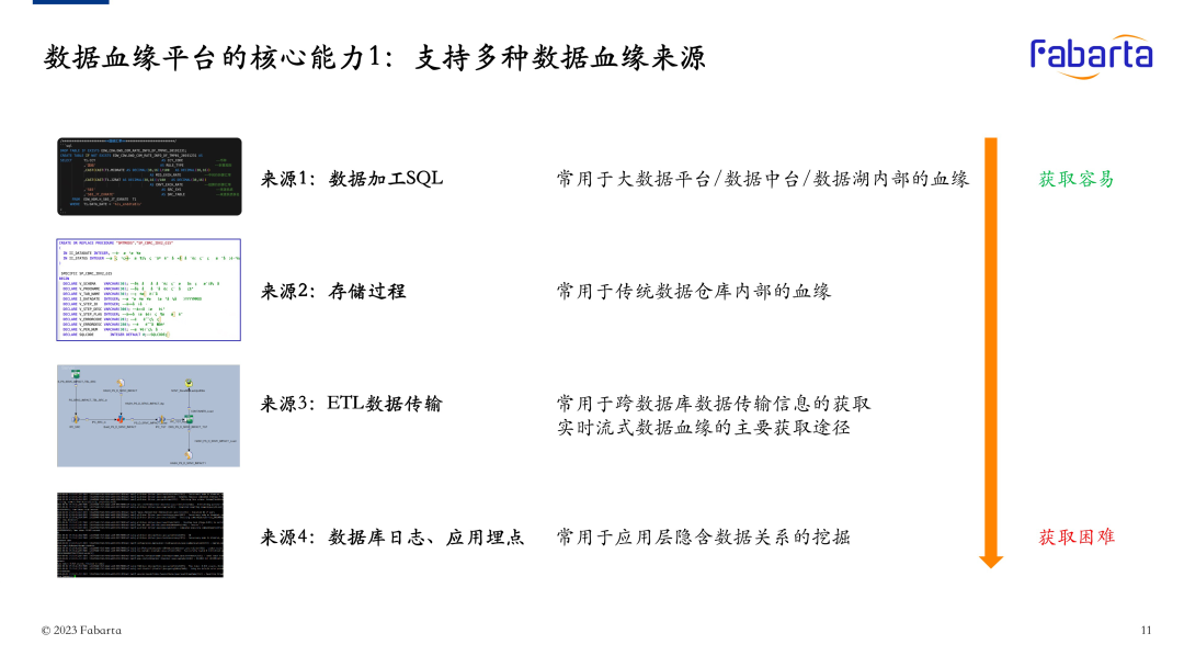 第一个数据血缘平台的核心能力:支持多种数据血缘来源。血缘关系的来源多种多样。首先,我们需要确定血缘关系的起源。对于多样化的血缘关系,存在多个可能的来源。其中,数据加工的 SQL 端是较为常见且相对容易解析的来源之一。在大数据平台或数据中台内部,通过解析 SQL 语句或利用开源工具,可以提取出数据加工过程中的血缘关系。对于仅关注内部大数据平台或数据中台的血缘关系,这一层可能已经足够满足需求。
