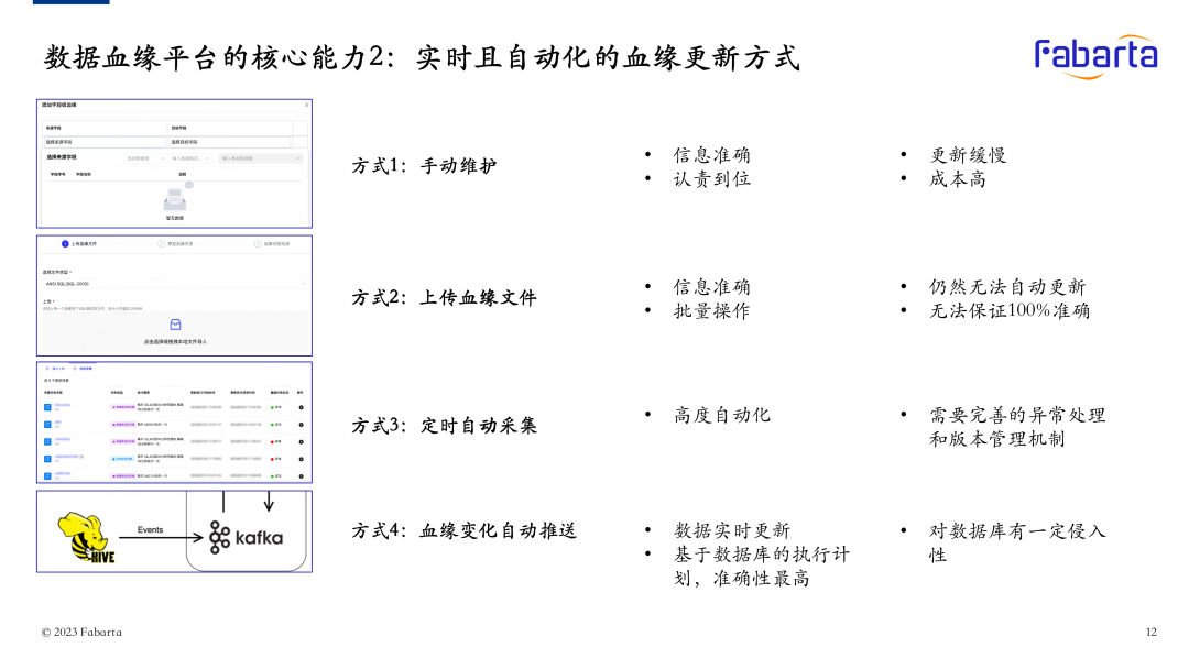 第二个核心能力:实时且自动化的血缘更新方式。前面已经提到,全链路血缘关系的变化非常迅速,因此采用适当的血缘更新方式至关重要。手动维护是一种必备的能力,虽然它可能很困难,但它是准确性最高且实现成本最低的方式。由于无法保证数据解析的百分之百准确和完整,手动维护作为一种兜底手段是必要的。手动维护的信息准确性最高,每一项的录入都由人负责,但更新速度相对较慢,成本较高。另一种常用的血缘解析方式是上传血缘文件,这是一种高效的批量更新血缘关系的方式。它基于血缘数据的载体通常是 SQL 脚本或存储过程,将它们写入文件中,然后上传该文件以高效地更新血缘关系。这种方式同样具有比较高的准确性,因为它不需要过于复杂的技术,只需通过语法解析即可提取血缘文件中的血缘关系。它的效率也很高,因为一个文件可以容纳大量的血缘关系,并且可以一次性上传多个文件进行批量操作。然而,它仍然存在一个问题,即它不是自动触发的过程,仍然需要人工干预。由于它是程序化解析的过程,无法保证百分之百的准确性,仍然需要人工辅助。第三种常见的方式是定时自动采集,这种方式相对容易实现,并没有太多的技术难度,主要是工程上的处理。它需要兼容不同血缘文件格式和来源,并处理异常情况。由于是自动化采集,更新过程必然涉及版本管理,包括新增、消失和修改血缘关系。由于都是自动化处理,需要保留自动化处理的记录,并具备版本更新的机制。这需要在工程上进行良好的处理,才能成为一个合格的定时自动血缘采集系统。第四种方式血缘变化自动推送,目前在云环境中被广泛采用。它能够同时控制底层数据库技术和上层血缘平台技术,实现实时的自动血缘更新和推送。一旦血缘发生变化,不是由血缘平台主动抓取,而是由数据库或数据平台主动推送给血缘平台。这种方式的技术难度最高,但可以实现实时更新,并且准确性最高。因为它是由底层平台推送的,已经对原始脚本进行了加工处理,或者从技术角度来说,是由执行计划产生的血缘,因此准确性较高。然而,它对数据库有一定的侵入性。在实际操作中,常见的血缘更新方式通常是将这四种方法结合使用。对于处理技术较为先进的底层数据平台,可以采用血缘变化自动推送的方式。一些开源大数据平台或自研大数据平台的云平台厂商已经具备了自动推送血缘变化的能力。此外,手动上传文件的方式或者定时采集的方法也可以用来补充,以确保血缘关系的及时获取。当存在不确定性时,常常采用手动维护的方式进行补充。以上是四种常见的血缘更新方式。3.核心能力 3:丰富的血缘地图交互方式